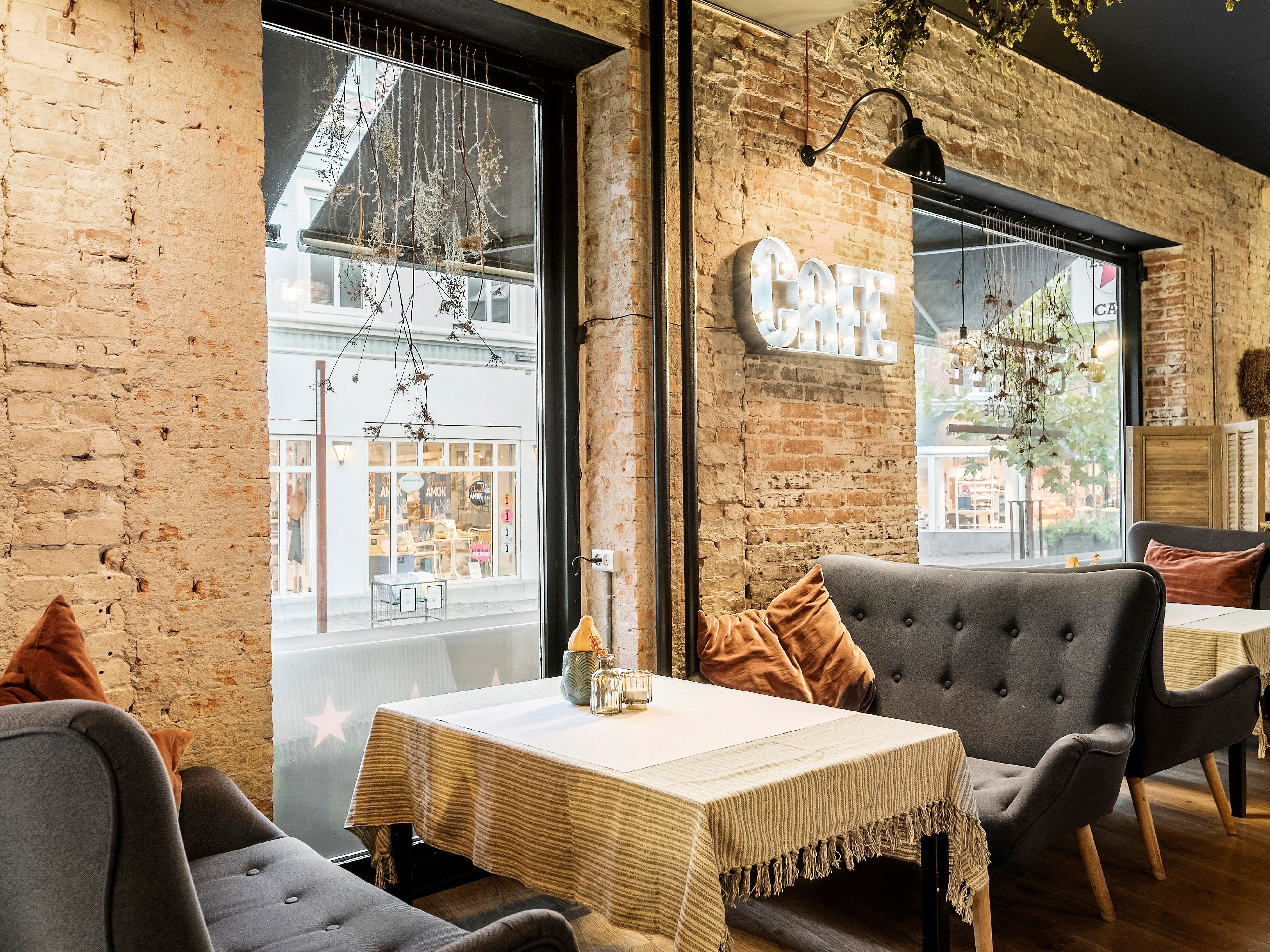 Caféen er et hyggeligt sted, hvor du kan slappe af og nyde en god kop kaffe eller te. Eks. efter en shoppingtur i de omkringliggende butikker.